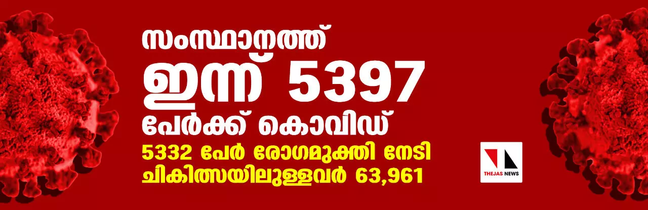 സംസ്ഥാനത്ത് ഇന്ന് 5397 പേര്ക്ക് കൊവിഡ്, 5332 പേര് രോഗമുക്തി നേടി; ചികിത്സയിലുള്ളവര് 63,961;