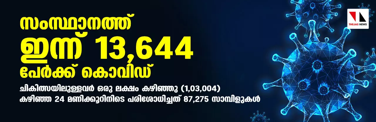 സംസ്ഥാനത്ത് ഇന്ന് 13,644 പേര്ക്ക് കൊവിഡ്; ചികിത്സയിലുള്ളവര് ഒരു ലക്ഷം കഴിഞ്ഞു (1,03,004)