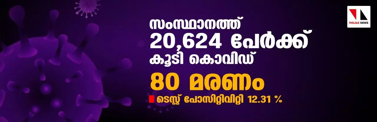 സംസ്ഥാനത്ത് ഇന്ന് 20,624 പേര്ക്ക് കൊവിഡ്; ടെസ്റ്റ് പോസിറ്റിവിറ്റി നിരക്ക് 12.31; മരണം 80