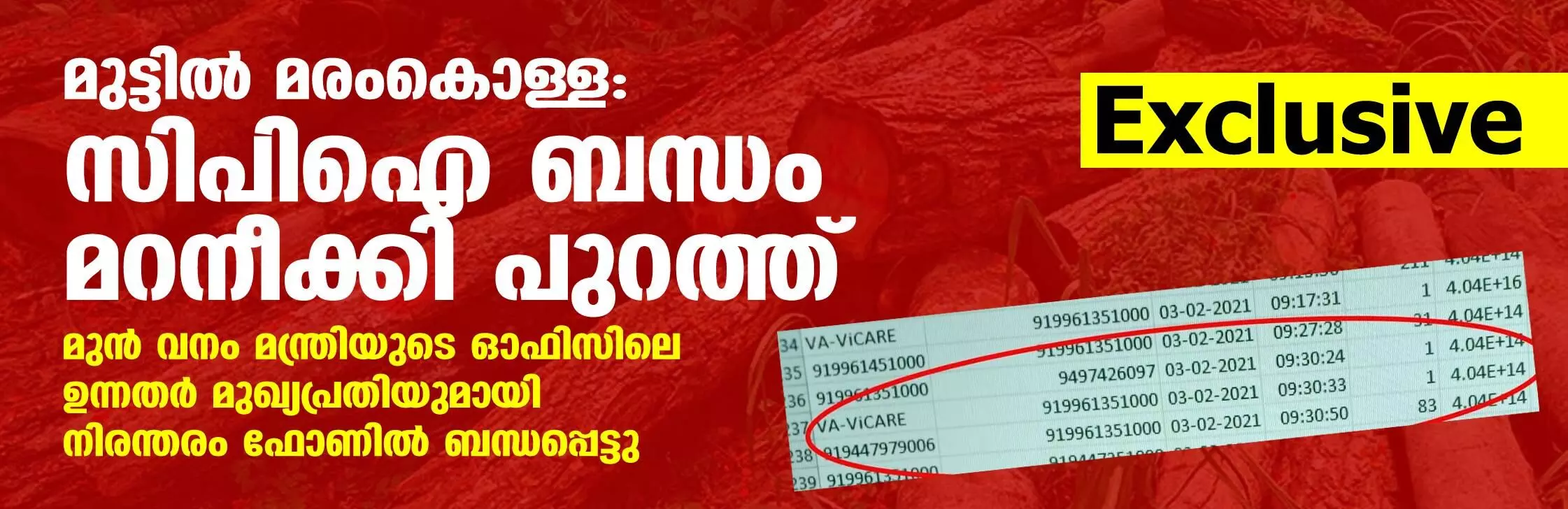 മുട്ടില് മരംകൊള്ള: സിപിഐ ബന്ധം മറനീക്കി പുറത്ത്; മുന് വനം മന്ത്രിയുടെ ഓഫിസിലെ ഉന്നതര് മുഖ്യപ്രതിയുമായി നിരന്തരം ഫോണില് ബന്ധപ്പെട്ടു