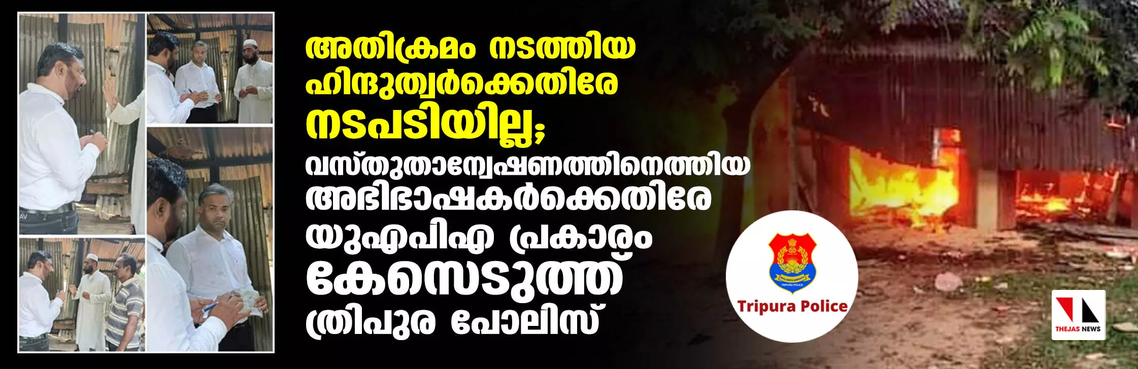 അതിക്രമം നടത്തിയ ഹിന്ദുത്വര്ക്കെതിരേ നടപടിയില്ല; വസ്തുതാന്വേഷണത്തിനെത്തിയ അഭിഭാഷകര്ക്കെതിരേ യുഎപിഎ പ്രകാരം കേസെടുത്ത് ത്രിപുര പോലിസ്