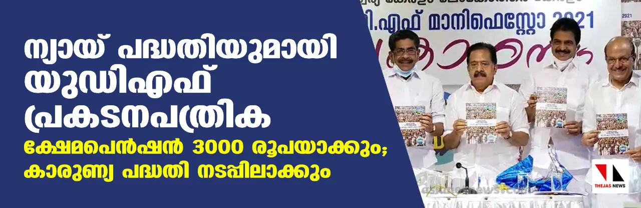 ന്യായ് പദ്ധതിയുമായി യുഡിഎഫ് പ്രകടനപത്രിക; ക്ഷേമപെന്ഷന് 3000 രൂപയാക്കും; കാരുണ്യ പദ്ധതി നടപ്പിലാക്കും