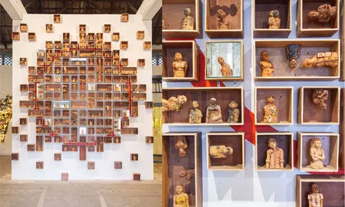 ഭിത്തികളില് തൂങ്ങുന്ന കളിമണ് പ്രതിമകളുമായി സ്റ്റുഡന്റ്സ് ബിനാലെയില് അഭിജിത്ത്