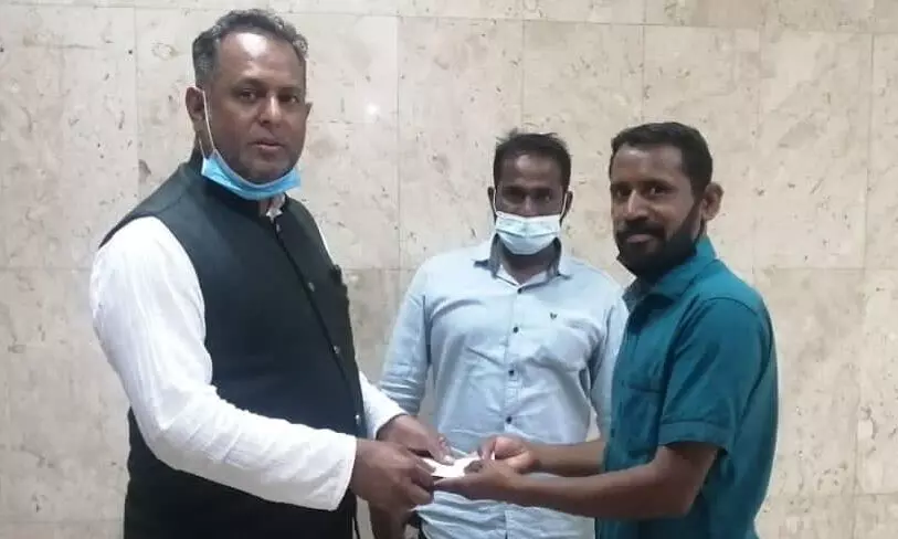 സ്നേഹ രാജന്റെ യാത്രാരേഖകള് ഹനീഫ മഞ്ചേശ്വരം കൈമാറുന്നു. ഇന്ത്യന് സോഷ്യല് ഫോറം ബ്രാഞ്ച് ഭാരവാഹി കബീര് അഞ്ചാലുംമൂട് സമീപം.