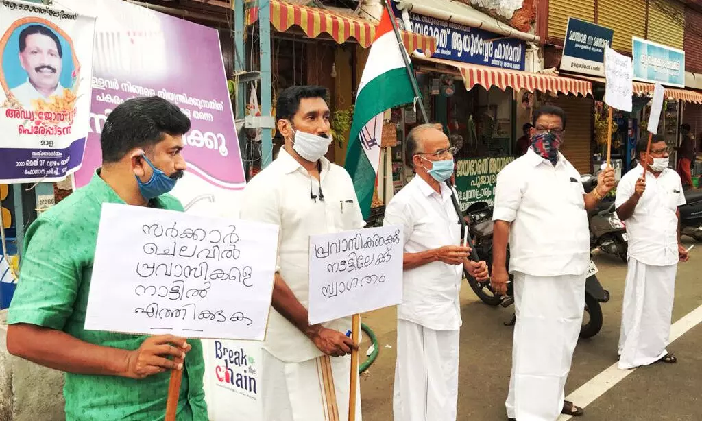 ലോക്ക് ഡൗണ് ചട്ടങ്ങള് പാലിച്ച് അഞ്ചുപേരെ സംഘടിപ്പിച്ചായിരുന്നു സമരം. പ്രതിഷേധത്തിന് മണ്ഡലം പ്രസിഡന്റ് എം പി സോണി, എം എ അബ്ദുല് ഷുക്കൂര്, മാനാത്ത് രാജേന്ദ്രന്, ടി പി പരമേശ്വരന് നമ്പൂതിരി, വി എസ് അരുണ് രാജ്, പി ഐ അസൈനാര്, ഇ എം റിയാസ്, ജോപ്പി മങ്കിടിയാന്, സുഭാഷ് പനങ്ങാടന് നേതൃതം നല്കി. വിദേശത്ത് നിന്നെത്തുന്ന മലയാളികള്ക്ക് ഐക്യദാര്ഢ്യം പ്രഖ്യാപിച്ച് കുഴുര് വിളക്കുംകാല് ജങ്ഷനില് മെഴുകുതിരി കത്തിക്കല് ചടങ്ങ് സംഘടിപ്പിച്ചു.