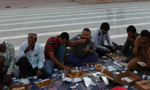 മഗ് രിബ് ബാങ്ക് വിളിക്കാനുള്ള സമയമടുത്തപ്പോൾ പലവഴികളിൽ നിന്നായി തദ്ദേശവാസികളായ അറബികൾ വന്നുതുടങ്ങി. ഗ്രാമിണ അറബികൾ. അവരുടെ കൈകളിൽ വീട്ടിൽ നിന്നുണ്ടാക്കിയ വിഭവങ്ങളും ഈത്തപ്പഴക്കൊട്ടകളും. വിഭവങ്ങൾ അവർ പന്തലിൽ ഇരിക്കുന്നവ രുടെ പാത്രങ്ങളിൽ വിളമ്പി. ബാങ്ക് കൊടുക്കുമ്പോഴേക്ക് എല്ലാവരുടെയും പാത്രങ്ങൾ നിറഞ്ഞുകവിഞ്ഞു . ഈത്തപ്പഴവും മറ്റും ആവശ്യത്തിലേറെ. അറബികളും ഞങ്ങൾക്കൊപ്പമിരുന്ന് നോമ്പ് തുറന്നു. സ്വദേ ശിയെന്നോ വിദേശിയെന്നോ ഭേദങ്ങളില്ലാതെ , തൊഴിലാളിയെന്നോ മുതലാളിയെന്നോ പക്ഷപാതമില്ലാതെ ! എല്ലാവർക്കും മറ്റുള്ളവരെ ഊട്ടുന്ന തിൽ അമിത താത്പര്യം. ഉച്ചനീചത്വ ങ്ങൾ മറന്ന് ഒന്നായ നിമിഷം. വലിയൊരു തളികയിൽ നിന്ന് കൈകൊണ്ടുതന്നെ എല്ലാവരും എടുത്തു കൊടുക്കുന്നു . ആർക്കുമതിന് എതിർ പ്പില്ല. ദേശഭേദ ചിന്തകൾ അപ്രസ ക്തമായ നിമിഷങ്ങൾ.