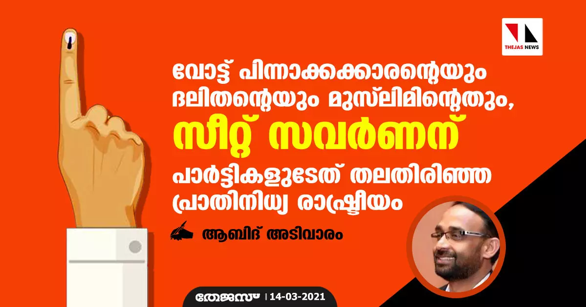 വോട്ട് പിന്നാക്കക്കാരന്റെയും ദലിതന്റെയും മുസ്ലിമിന്റെതും, സീറ്റ് സവര്ണന്; പാര്ട്ടികളുടേത് തലതിരിഞ്ഞ പ്രാതിനിധ്യ രാഷ്ട്രീയം