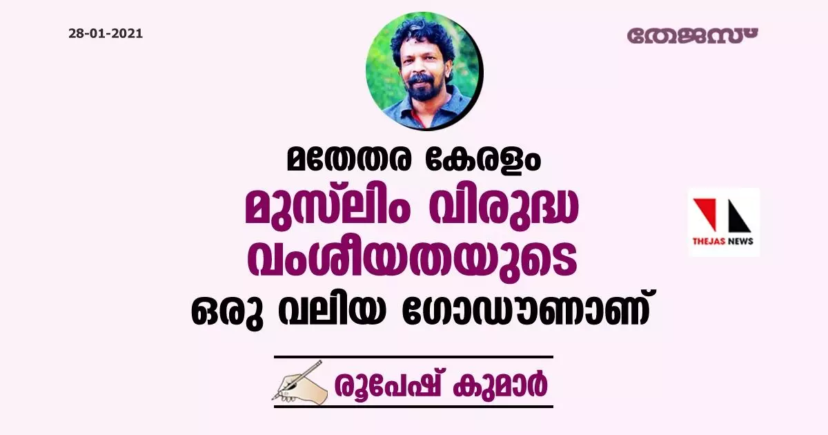 കോഴിക്കോട്: വിദ്വേഷരാഷ്ട്രീയം കൊണ്ടുനടക്കുന്നവര് മാത്രമല്ല, വര്ഗസമരം വിഭാവനം ചെയ്യുന്നവരില് പോലും വര്ഗീയതയുടെ ഒളിയജണ്ടകളാണ് നിലകൊള്ളുന്നതെന്ന് സമീപകാല സംഭവങ്ങള് വെളിപ്പെടുത്തുന്നു. അധികാരത്തുടര്ച്ചയ്ക്കു വേണ്ടി പ്രായോഗിക രാഷ്ട്രീയത്തില് എന്തിനെയും തരാതരം ഉപയോഗിക്കുന്ന എന്നതിലേക്ക് കേരള രാഷ്ട്രീയവും മാറിക്കൊണ്ടിരിക്കുകയാണ്. ഇതിനിടെയാണ് കഴിഞ്ഞ ദിവസങ്ങളില് സാമൂഹിക മാധ്യമങ്ങളിലെ ചര്ച്ചകളില് പോലുമുള്ള മുസ് ലിം വിരുദ്ധതയെ കുറിച്ച് എഴുത്തുകാരനായ രൂപേഷ് കുമാര് വിലയിരുത്തുന്നത്.