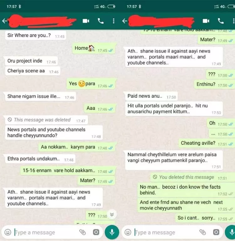 എന്റെ ഒരു പ്രിയ സുഹൃത്തിനുവന്ന മെസേജാണിത്. ഇത് കണ്ടതിനു ശേഷം ഇത് ഇവിടെ പോസ്റ്റ് ചെയ്യാതിരിക്കാന് എനിക്ക് തോന്നിയില്ല. കാരണം ഷെയിന് നിഗം വളര്ന്നുവരുന്ന ഒരു കലാകാരനാണ്. ഇത് വായിച്ചതില് പിന്നെ ഒരു കാര്യം ഉറപ്പിച്ചു. ഇനിയങ്ങോട്ട് എന്നാല് കഴിയുന്ന എല്ലാ ഓണ്ലൈന് സപ്പോര്ട്ടും ഷെയിന്റെ കൂടെ ആയിരിക്കും. മോജു മോഹന് എന്ന എന്റെ പ്രിയ സുഹൃത്ത് എനിക്കയച്ച മെസ്സേജാണിത്. കഴിഞ്ഞ പാര്ലിമെന്റ് തിരെഞ്ഞെടുപ്പില് നാലഞ്ചു സ്ഥാനാര്ഥികള്ക്ക് വേണ്ടി ഡിജിറ്റല് മീഡിയ പ്രവര്ത്തനങ്ങള് ഏകോപിക്കുന്നതിനും നേതൃത്വം നല്കുന്നതിനും അവസരം ലഭിച്ചിരുന്നു. അന്നത്തെ ബന്ധത്തില് നിന്നും രണ്ടു ദിവസം മുന്നേ ഒരു മെസ്സേജ് വരികയുണ്ടായി. ഷെയിന് നിഗം ആണ് വിഷയം. ന്യൂസ് പോര്ട്ടല്സ്, യൂട്യൂബ് ചാനല് എന്നിവ ഉണ്ടോ? ഹിറ്റിന് അനുസരിച്ചു പേയ്മെന്റ് കിട്ടും, ഷെയിന് നിഗത്തിനെതിരെ പോസ്റ്റ്, സ്റ്റോറീസ് വരണം. അതായത് 'പെയ്ഡ് ന്യൂസ്'. വാര്ത്തകളില് നിന്ന് അറിഞ്ഞ ഷെയിന് നിഗം വില്ലനായിരുന്നു. പക്ഷേ പിന്നാമ്പുറങ്ങള് അറിയാത്തത് കൊണ്ട് ഒരുതരത്തിലും പ്രതികരിക്കാന് തോന്നിയിരുന്നില്ല. ഒരുകാര്യം ഉറപ്പാണ്. ഷെയിന് മാത്രമല്ല വില്ലന്. ഒതുക്കാന് നല്ല ഗെയിം പ്ലാന് നടക്കുന്നുണ്ട്. തെറ്റ് ചെയ്തിട്ടുണ്ടെങ്കില് ശിക്ഷിക്കപ്പെടട്ടെ.. വിലക്കിനോട് യോജിപ്പില്ല.. ഒതുക്കലിനോടും..