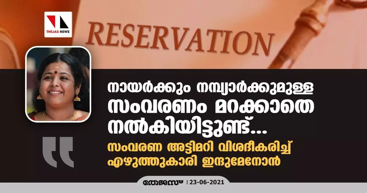 നായര്ക്കും നമ്പ്യാര്ക്കുമുള്ള സംവരണം മറക്കാതെ നല്കിയിട്ടുണ്ട്...; സംവരണ അട്ടിമറി വിശദീകരിച്ച് എഴുത്തുകാരി ഇന്ദുമേനോന്