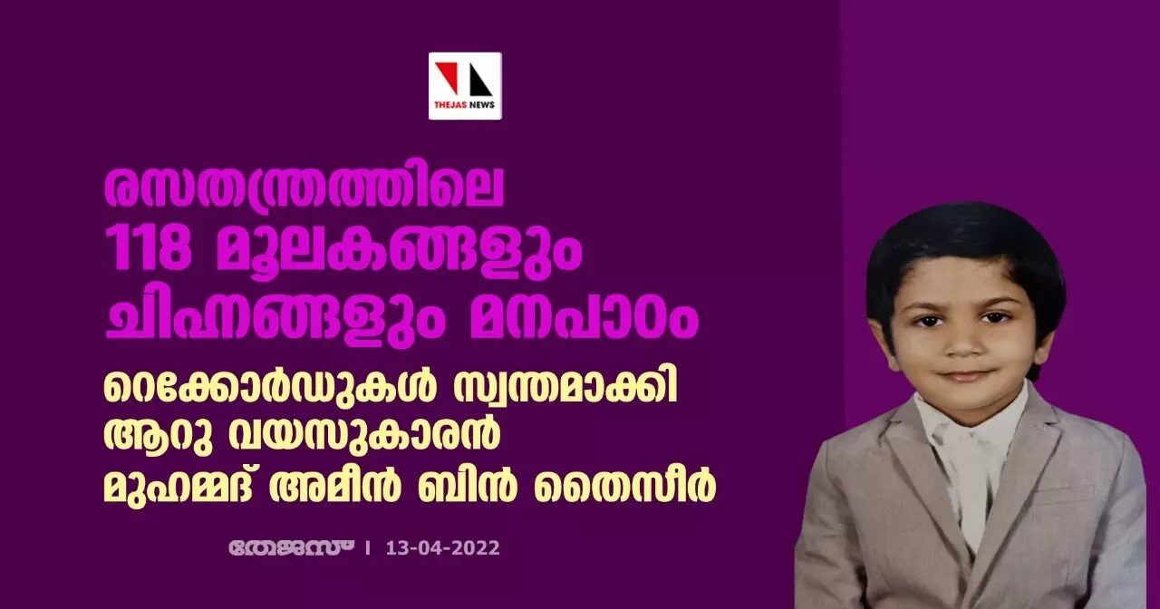 രസതന്ത്രത്തിലെ 118 മൂലകങ്ങളും ചിഹ്നങ്ങളും മനപാഠം; റെക്കോര്ഡുകള് സ്വന്തമാക്കി ആറു വയസുകാരന് മുഹമ്മദ് അമീന് ബിന് തൈസീര്