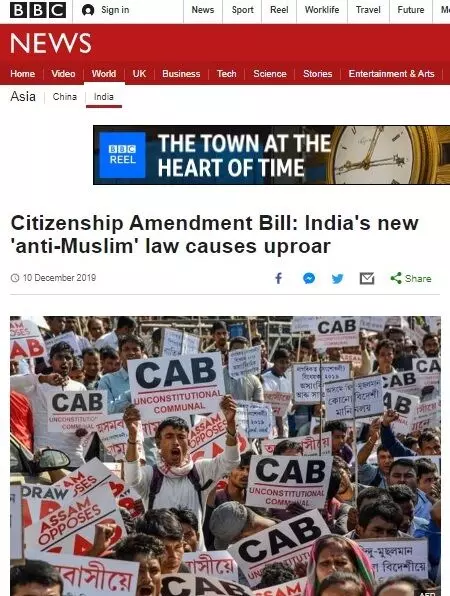 പാര്ലിമെന്റില് പാസ്സാക്കിയ പൗരത്വ ഭേദഗതി ബില്ലിനെതിരെ ഇന്ത്യയില് പ്രക്ഷോഭം ശക്തമാകുന്നതായി ബിബിസി അടക്കമുള്ള വാര്ത്താ മാധ്യമങ്ങള് റിപ്പോര്ട്ട് ചെയ്തു.