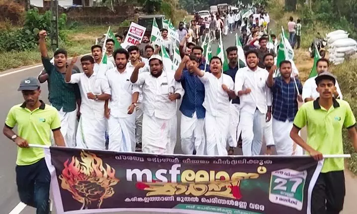 പെരിന്തല്മണ്ണ: പൗരത്വ നിയമ ഭേദഗതിയും എന്ആര്സിയും പിന്വലിക്കണമെന്നാവശ്യപ്പെട്ട് പെരിന്തല്മണ്ണയില് എംഎസ്എഫ് മണ്ഡലം കമ്മിറ്റിയുടെ നേതൃത്വത്തില് ലോങ് മാര്ച്ച് സംഘടിപ്പിച്ചു. വെള്ളിയാഴ്ച വൈകീട്ട് നാലരക്ക് കരിങ്കല്ലത്താണിയില് നിന്നും ആരംഭിച്ച മാര്ച്ച് വൈകീട്ട് എട്ടിന് പെരിന്തല്മണ്ണയില് സമാപിച്ചു. കരിങ്കല്ലത്താണിയില് മഞ്ഞളാംകുഴി അലി എം.എല്.എ ഉദ്ഘാടനം ചെയ്തു. നാലകത്ത് സൂപ്പി, മണ്ഡലം മുസ്്ലിംലീഗ് പ്രസിഡന്റ് അഡ്വ. എ.കെ മുസ്തഫ, സീനിയര് വൈസ് പ്രസിഡന്റ് എ.കെ നാസര് മാസ്റ്റര്, ജില്ലാ എം.എസ്.എഫ് പ്രസിഡന്റ് റിയാസ് പുല്പ്പറ്റ, ജനറല് സെക്രട്ടറി കബീര് മുതുപറമ്പ്, താഴെക്കോട് പഞ്ചായത്ത് മുസ്്ലിംലീഗ് പ്രസിഡന്റ് പി.ടി ഖാലിദ് മാസ്റ്റര്, സെക്രട്ടറി വി.പി റഷീദ് മാസ്റ്റര്, നാലകത്ത് ഷൗക്കത്ത്, റഷീദ് മേലാറ്റൂര്, സി.ടി നൗഷാദലി, ഹഫാര് കുന്നപ്പള്ളി, നബീല് വട്ടപ്പറമ്പ്, പി.ടി മുറത്ത്, വി ജുനൈദ്, ആര്.വി ഷാഫി, ഹാസില്, ഉനൈസ്, സുല്ത്താന്, റഹീസ്, ഷജീബ്, ഹഫീസ് എന്നിവര് നേതൃത്വം നല്കി.