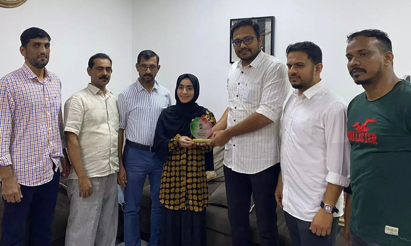 പഠന മേഖലയിലെ കഴിവ് പരിഗണിച്ച് യു എ ഇ ഗവണ്മെന്റ് ഗോള്ഡന് വിസ നല്കി ആദരിച്ച മലയാളി വിദ്യാര്ത്ഥിനിയെ കേരള പ്രവാസി ഫോറം ഷാര്ജ മൊമെന്റോ നല്കി അനുമോദിച്ചു.