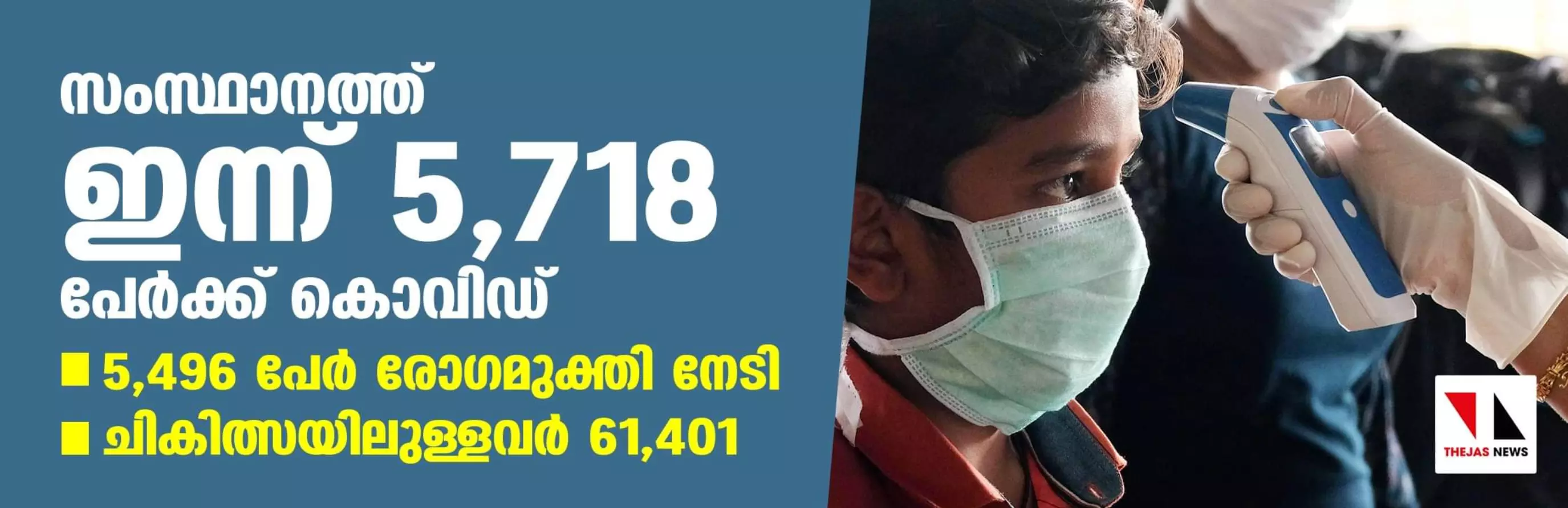 തിരുവനന്തപുരം: കേരളത്തില് ഇന്ന് 5718 പേര്ക്ക് കൊവിഡ്-19 സ്ഥിരീകരിച്ചതായി ആരോഗ്യ വകുപ്പ് മന്ത്രി കെ.കെ. ശൈലജ ടീച്ചര് അറിയിച്ചു. മലപ്പുറം 943, കോഴിക്കോട് 773, കോട്ടയം 570, തൃശൂര് 528, എറണാകുളം 486, പാലക്കാട് 447, ആലപ്പുഴ 394, കൊല്ലം 318, തിരുവനന്തപുരം 279, കണ്ണൂര് 275, ഇടുക്കി 216, വയനാട് 180, പത്തനംതിട്ട 163, കാസര്ഗോഡ് 146 എന്നിങ്ങനേയാണ് ജില്ലകളില് ഇന്ന് രോഗ ബാധ സ്ഥിരീകരിച്ചത്.