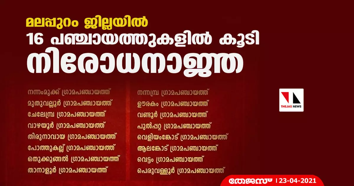 നന്നംമുക്ക്, മുതുവല്ലൂര്, ചേലേമ്പ്ര, വാഴയൂര്, തിരുനാവായ, പോത്തുകല്ല്, ഒതുക്കുങ്ങല്, താനാളൂര്, നന്നമ്പ്ര, ഊരകം, വണ്ടൂര്, പുല്പ്പറ്റ, വെളിയംങ്കോട്, ആലങ്കോട്, വെട്ടം, പെരുവള്ളൂര് എന്നീ പതിനാറ് പഞ്ചായത്തുകളിലാണ് നിരോധനാജ്ഞ പ്രഖ്യാപിച്ചത്. ജില്ലയില് ഇന്നലെ 2,776 പേര്ക്ക്് കൊവിഡ് സ്ഥിരീകരിച്ചിരുന്നു. 15,221 പേരാണ് ഇപ്പോള് മലപ്പുറം ജില്ലയില് കൊവിഡ് ബാധിച്ച് ചികില്സയിലുള്ളത്. 30,484 പേര് നിരീക്ഷണത്തിലുമുണ്ട്.