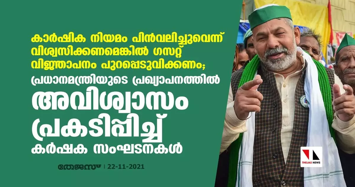 കാര്ഷിക നിയമം പിന്വലിച്ചുവെന്ന് വിശ്വസിക്കണമെങ്കില് ഗസറ്റ് വിജ്ഞാപനം പുറപ്പെടുവിക്കണം; പ്രധാനമന്ത്രിയുടെ പ്രഖ്യാപനത്തില് അവിശ്വാസം പ്രകടിപ്പിച്ച് കര്ഷക സംഘടനകള്