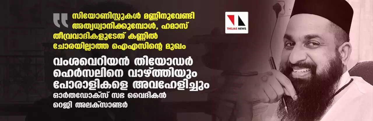 'സിയോണിസ്റ്റുകള് മണ്ണിനുവേണ്ടി അത്യധ്വാനിക്കുമ്പോള്, ഹമാസ് തീവ്രവാദികളുടേത് ഐഎസിന്റെ മുഖം'; വംശവെറിയന് തിയോഡര് ഹെര്സലിനെ വാഴ്ത്തിയും പോരാളികളെ അവഹേളിച്ചും ഓര്തഡോക്സ് സഭ വൈദികന് റെജി അലക്സാണ്ടര്