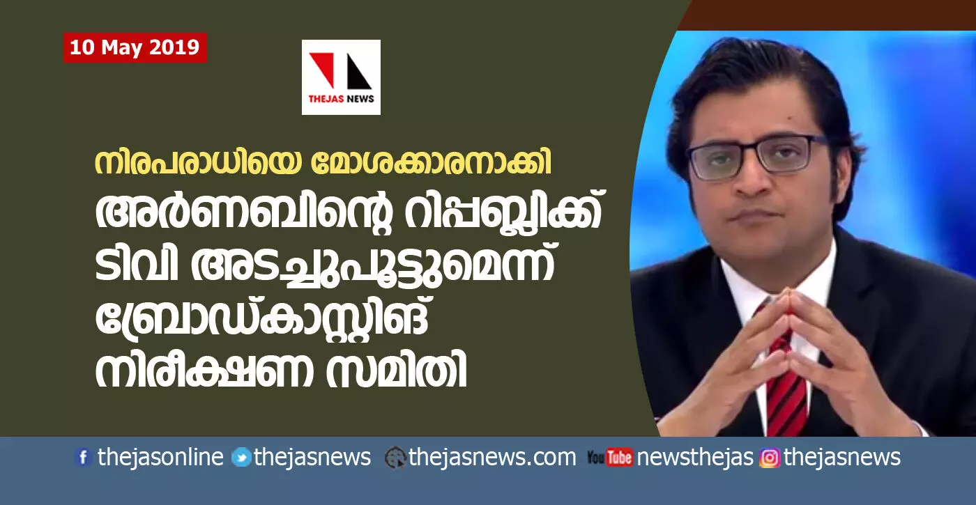 നിരപരാധിയെ മോശക്കാരനാക്കി; അര്ണബിന്റെ റിപ്പബ്ലിക്ക് ടിവി അടച്ചുപൂട്ടുമെന്ന് സംപ്രേക്ഷണ നിരീക്ഷണ സമിതി
