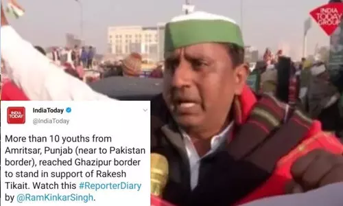 ''പഞ്ചാബിലെ അമൃത്സര് ജില്ലയിലെ(പാകിസ്താന് അതിര്ത്തി) ഗ്രാമത്തില് നിന്ന് പത്തോളം യുവാക്കള് രാകേഷ് ടിക്കായത്തിനെ കാണാന് ഗാസിപൂരിലെത്തി''- ഇന്ത്യാ ടുഡെ ട്വീറ്റ് ചെയ്തു.