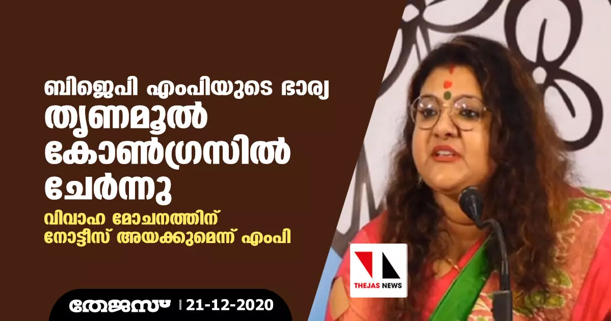 ബിജെപി എംപിയുടെ ഭാര്യ തൃണമൂല് കോണ്ഗ്രസില് ചേര്ന്നു: വിവാഹ മോചനത്തിന് നോട്ടീസ് അയക്കുമെന്ന് എംപി
