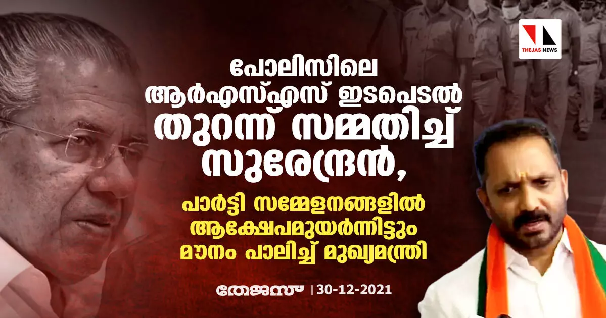 പോലിസില് ആര്എസ്എസ് സ്ലീപ്പിങ് സെല്ലുണ്ടെന്ന് സമ്മതിച്ച് സുരേന്ദ്രന്; പാര്ട്ടി സമ്മേളനങ്ങളില് ആക്ഷേപമുയര്ന്നിട്ടും മൗനം പാലിച്ച് മുഖ്യമന്ത്രി
