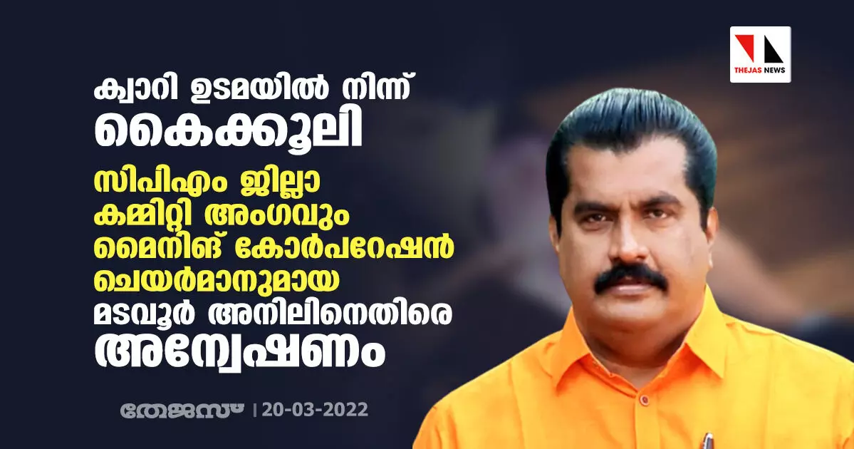 ക്വാറി ഉടമയില് നിന്ന് കൈക്കൂലി; സിപിഎം ജില്ലാ കമ്മിറ്റി അംഗവും മൈനിങ് കോര്പറേഷന് ചെയര്മാനുമായ മടവൂര് അനിലിനെതിരെ അന്വേഷണം
