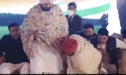 സിദ്ദുവിന്റെ പാദം നമസ്കരിച്ച് അനുഗ്രഹം തേടി ചന്നി; നാടകീയ രംഗങ്ങള്ക്ക് സാക്ഷിയായി കോണ്ഗ്രസ് സമ്മേളനം