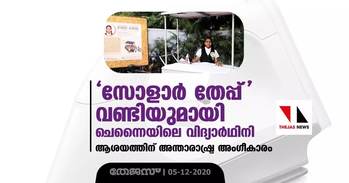 ' സോളാര് തേപ്പ്' വണ്ടിയുമായി ചെന്നൈയിലെ വിദ്യാര്ഥിനി; ആശയത്തിന് അന്താരാഷ്ട്ര അംഗീകാരം