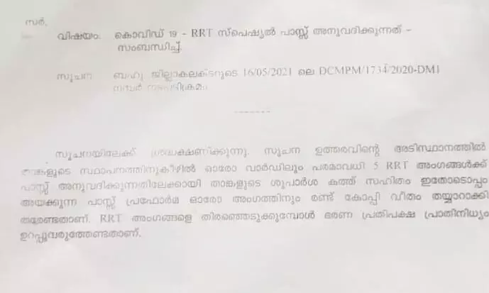 ഓരോ വാര്ഡിലുള്ള എല്ലാ രാഷ്ട്രീയ പാര്ട്ടിയിലും പെട്ട 5 പേര്ക്ക് സന്നദ്ധ സേവനത്തിന് തിരിച്ചറിയല് കാര്ഡ് നല്കണമെന്ന് ഉത്തരവില് പറയുന്നു.