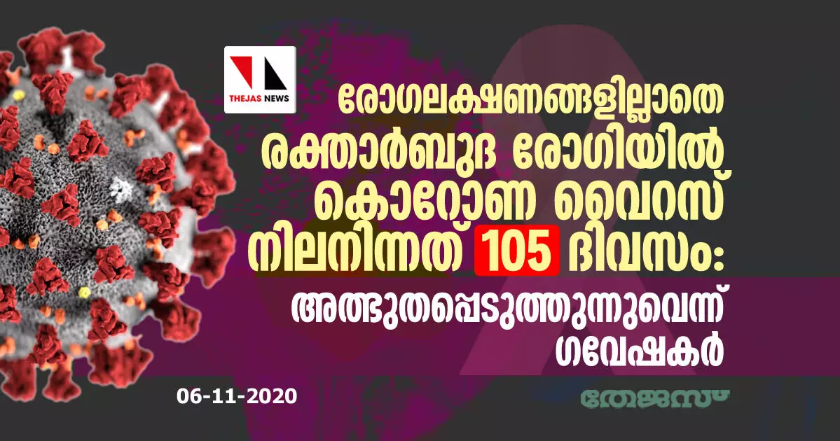 രോഗലക്ഷണങ്ങളില്ലാതെ രക്താര്ബുദ രോഗിയില് കൊറോണ വൈറസ് നിലനിന്നത് 105 ദിവസം: അത്ഭുതപ്പെടുത്തുന്നുവെന്ന് ഗവേഷകര്