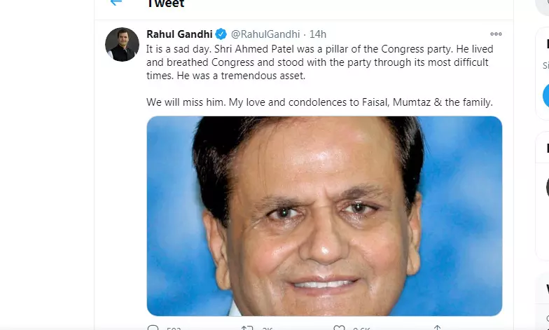 അഹമ്മദ് പട്ടേലിന്റെ മരണം; നഷ്ടപ്പെട്ടത് കോണ്ഗ്രസിന്റെ നെടുംതൂണ്: രാഹുല്ഗാന്ധി