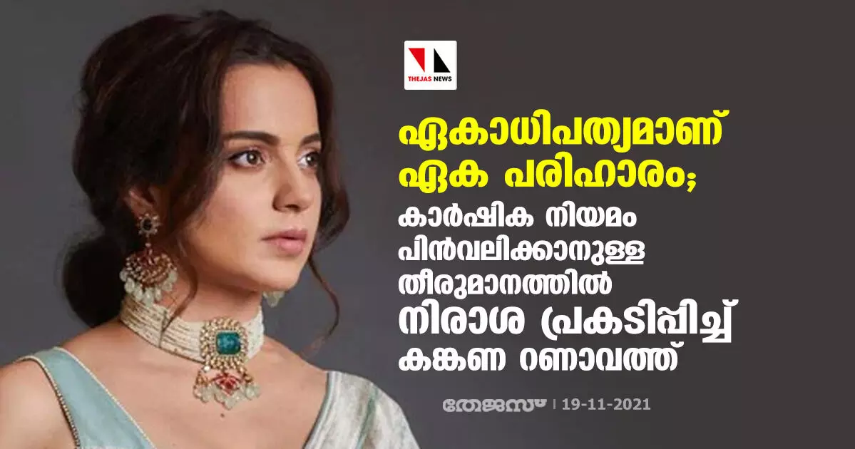 ഏകാധിപത്യമാണ് ഏക പരിഹാരം; കാര്ഷിക നിയമം പിന്വലിക്കാനുള്ള തീരുമാനത്തില് നിരാശ പ്രകടിപ്പിച്ച് കങ്കണ റണാവത്ത്