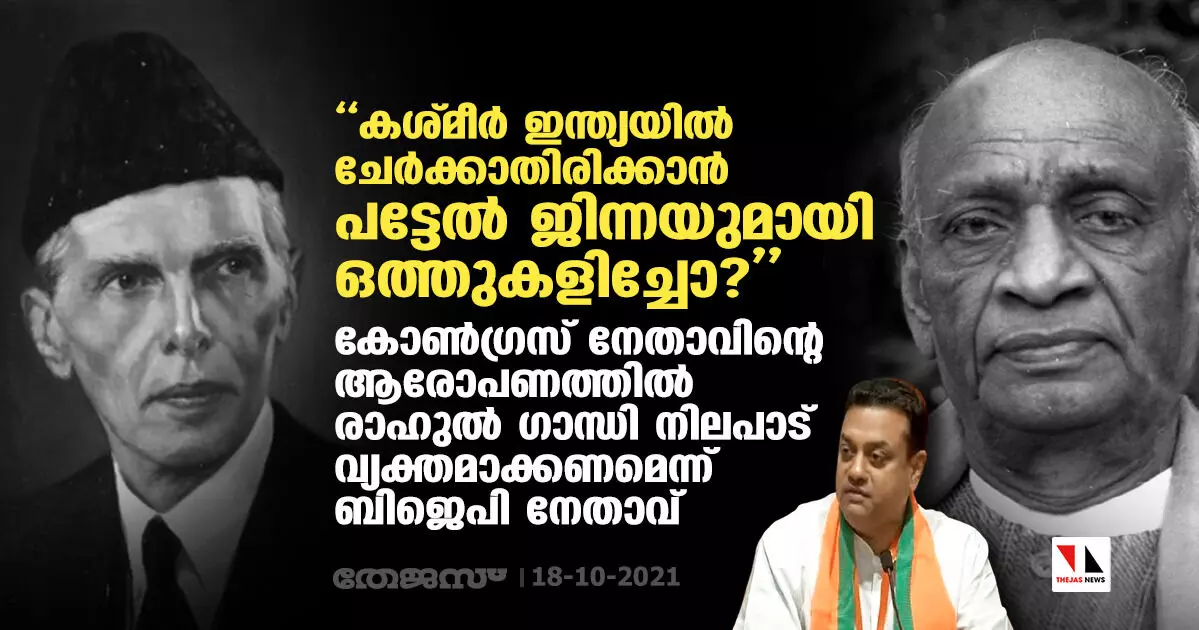 ''കശ്മീര് ഇന്ത്യയില് ചേര്ക്കാതിരിക്കാന് പട്ടേല് ജിന്നയുമായി ഒത്തുകളിച്ചോ?''; കോണ്ഗ്രസ് നേതാവിന്റെ ആരോപണത്തില് രാഹുല് ഗാന്ധി നിലപാട് വ്യക്തമാക്കണമെന്ന് ബിജെപി നേതാവ്