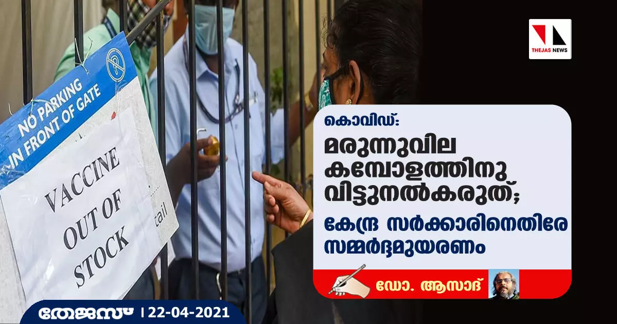 അവശ്യ മരുന്നുകളുടെ ലഭ്യതപോലും കോര്പറേറ്റ് ചൂതാട്ടത്തിനു വിട്ടു നല്കുന്ന സമീപനമാണ് നരേന്ദ്രമോദി സര്ക്കാര് കൈക്കൊള്ളുന്നത്. നമ്മുടെ രാജ്യത്തെ കൊവിഡ് വ്യാപന നിരക്ക് അതിവേഗം കുതിച്ചുയരുകയാണ്. മരണ നിരക്കും കൂടിയിട്ടുണ്ട്. കൂടുതല് മാരകമായ മാറ്റംവന്ന കൊവിഡിന്റെ ഈ പുതുകുതിപ്പില് പ്രതിരോധമൊരുക്കി രാജ്യത്തെ ജനങ്ങളെ രക്ഷിക്കാനുള്ള ബാദ്ധ്യത കേന്ദ്ര സര്ക്കാര് മറക്കുന്നു. സമീപ കാലത്ത് എല്ലാ മേഖലകളും കോര്പറേറ്റ് മത്സര മൂലധനത്തിന് തുറന്നു കൊടുത്ത മോദിസര്ക്കാര് കൊവിഡ് പ്രതിരോധ കുത്തിവെപ്പും വിലപേശല് വിപണിക്കു നല്കി ജനങ്ങളുടെ ജീവിതം വെച്ചു പന്താടുകയാണ്.