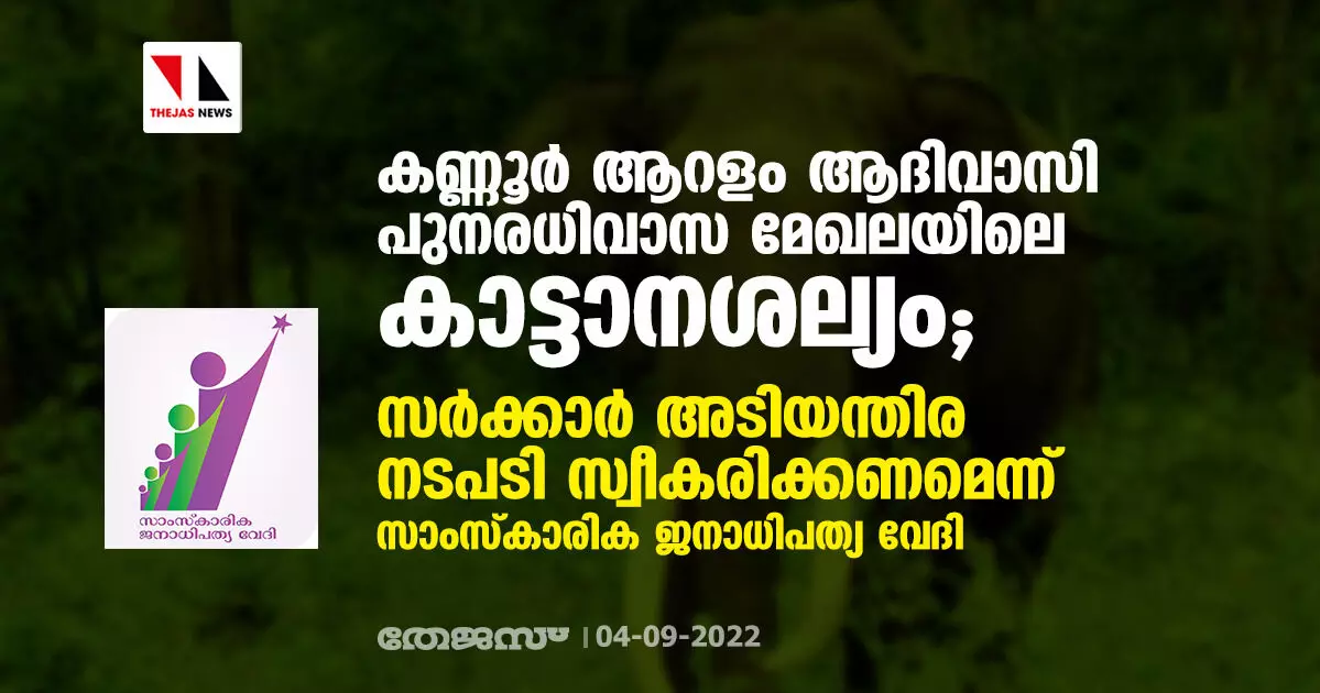 കണ്ണൂര് ആറളം ആദിവാസി പുനരധിവാസ മേഖലയിലെ കാട്ടാനശല്യം; സര്ക്കാര് അടിയന്തിര നടപടി സ്വീകരിക്കണമെന്ന് സാംസ്കാരിക ജനാധിപത്യ വേദി