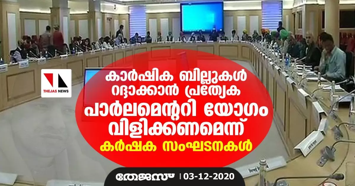 കാര്ഷിക ബില്ലുകള് റദ്ദാക്കാന് പ്രത്യേക പാര്ലമെന്ററി യോഗം വിളിക്കണമെന്ന് അനുരഞ്ജന ചര്ച്ചയില് കര്ഷക സംഘടനകള്