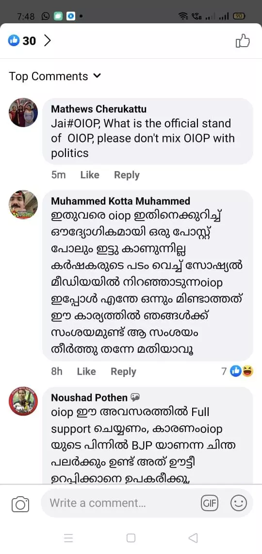 കര്ഷക സമരത്തെ അനുകൂലിച്ച് ഒഐഒപിയുടെ എഫ്ബി പേജില് പോസ്റ്റു ചെയ്യുന്ന സന്ദേശങ്ങള് അഡിമിന് നീക്കം ചെയ്യുകയാണ് എന്നും കുറ്റപ്പെടുത്തുന്നു