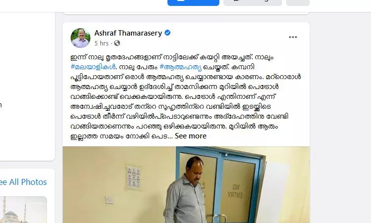 നാട്ടിലേക്ക് നാല് മൃതദേഹങ്ങള് അയച്ചു, എല്ലാം ആത്മഹത്യ ചെയ്തവര്; മനസ്സു നീറ്റുന്ന കുറിപ്പുമായി അഷറഫ് താമരശ്ശേരി