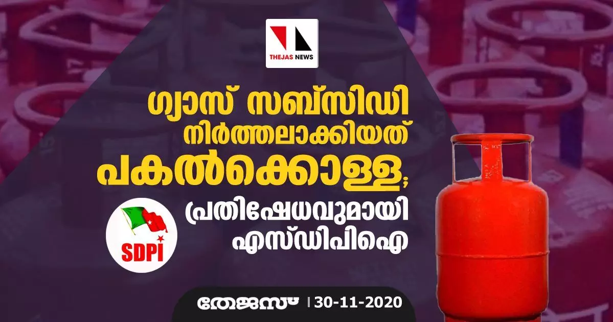 തിരുവനന്തപുരം: കൊവിഡ് മഹാമാരിയില് നട്ടംതിരിയുന്ന ജനങ്ങളെ ഗ്യാസ് സബ്സിഡി രഹസ്യമായി നിര്ത്തലാക്കി പകല്ക്കൊള്ള നടത്തുന്ന കേന്ദ്ര ബി.ജെ.പി സര്ക്കാരിന്റെ നടപടി പ്രതിഷേധാര്ഹമാണെന്ന് എസ്.ഡി.പി.ഐ സംസ്ഥാന ട്രഷറര് അജ്മല് ഇസ്മായീല്.