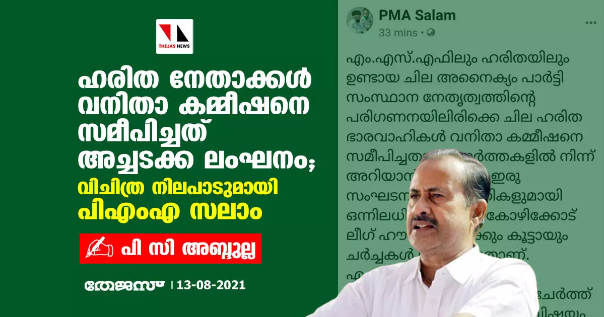 ''എം.എസ്.എഫിലും ഹരിതയിലും ഉണ്ടായ ചില അനൈക്യം പാര്ട്ടി സംസ്ഥാന നേതൃത്വത്തിന്റെ പരിഗണനയിലിരിക്കെ ചില ഹരിത ഭാരവാഹികള് വനിതാ കമ്മീഷനെ സമീപിച്ചതായി വാര്ത്തകളില് നിന്ന് അറിയാന് സാധിച്ചു. ഇരു സംഘടനാ ഭാരവാഹികളുമായി ഒന്നിലധികം തവണ കോഴിക്കോട് ലീഗ് ഹൗസില് ഒറ്റക്കും കൂട്ടായും ചര്ച്ചകള് നടത്തിയതാണ്. എം.എസ്.എഫ് സംസ്ഥാന പ്രവര്ത്തക സമിതി വിളിച്ച് ചേര്ത്ത് ഒരു പകല് മുഴുവനും ഈ വിഷയം ചര്ച്ച ചെയ്തതുമാണ്. മുസ് ലിം ലീഗ് സംസ്ഥാന ഉപാധ്യക്ഷന് കുട്ടി അഹമ്മദ്കുട്ടി, എം.എസ്.എഫിന്റെ ചുമതലയുളള പാര്ട്ടി സംസ്ഥാന സെക്രട്ടറി സി.പി ചെറിയ മുഹമ്മദ് എന്നിവരുടെ കൂടി സാന്നിധ്യത്തിലായിരുന്നു ചര്ച്ചകള് നടന്നത്. ഹരിത ഭാരവാഹികളുമായി എം.എസ്.എഫ് ദേശീയ ഭാരവാഹികള് ചര്ച്ച ചെയ്ത് റിപോര്ട്ട് നല്കിയതാണ്. അതുമായി ബന്ധപ്പെട്ട തുടര്നടപടികള് പാര്ട്ടി പരിഗണനയിലിരിക്കെ ഇത്തരം കാര്യങ്ങള് സംഘടനാ പരിധിക്ക് അപ്പുറത്തേക്ക് കൊണ്ട് പോകുന്നതും ഏറെ വിവാദങ്ങള് സൃഷ്ടിച്ച സംസ്ഥാന വനിതാകമ്മീഷനെ സമീപിച്ചതും അച്ചടക്കലംഘനമായി കാണാതിരിക്കാനാവില്ല'' ഫേസ് ബുക്ക് പോസ്റ്റില് പിഎം.എ സലാം പറയുന്നു.