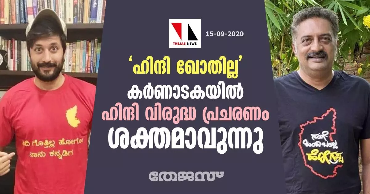 ബെംഗളുരു: തമിഴ്നാടിനു പിറകെ കര്ണാടകയിലും ഹിന്ദി വിരുദ്ധ വികാരം ശക്തമാകുന്നു. ഹിന്ദി ദിനമായി ആചരിച്ച സെപ്റ്റംബര് 14 ന് ഒരു കൂട്ടം സെലിബ്രിറ്റികളും അഭിനേതാക്കളും 'ഹിന്ദി ഗോഥില്ല' (ഞാന് ഹിന്ദി സംസാരിക്കില്ല), 'നംഗെ ഹിന്ദി ബരല്ല, ഹൊഗ്രപ്പ'(എനിക്ക് ഹിന്ദി അറിയില്ല, പോടോ) എന്നിവ എഴുതിയ സന്ദേശങ്ങളുള്ള ടി-ഷര്ട്ടുകള് ധരിച്ച് പ്രതിഷേധത്തില് പങ്കുചേര്ന്നു. പ്രമുഖ അഭിനേതാക്കളായ പ്രകാശ് രാജ്, ചേതന്, ധനഞ്ജയ എന്നിവരും സാമൂഹിക മാധ്യമങ്ങളില് പ്രതിഷേധവുമായി എത്തി.