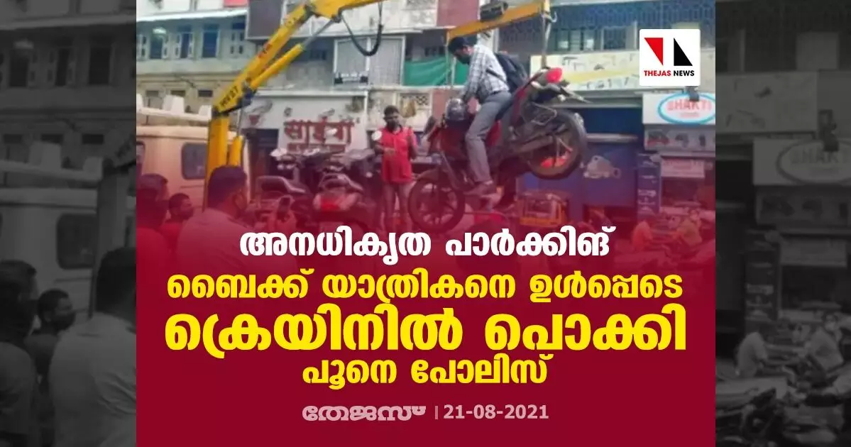 അനധികൃത പാര്ക്കിങ്; ബൈക്ക് യാത്രികനെ ഉള്പ്പെടെ ക്രെയിനില് പൊക്കി പൂനെ പോലിസ്