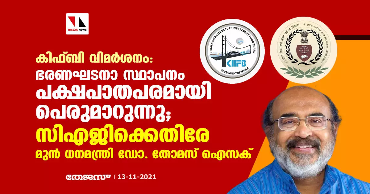 കിഫ്ബി വിമര്ശനം: ഭരണഘടനാ സ്ഥാപനം പക്ഷപാതപരമായി പെരുമാറുന്നു; സിഎജിക്കെതിരേ മുന് ധനമന്ത്രി ഡോ. തോമസ് ഐസക്