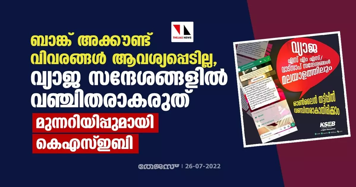 ബാങ്ക് അക്കൗണ്ട് വിവരങ്ങള് ആവശ്യപ്പെടില്ല, വ്യാജ സന്ദേശങ്ങളില് വഞ്ചിതരാകരുത്; മുന്നറിയിപ്പുമായി കെഎസ്ഇബി