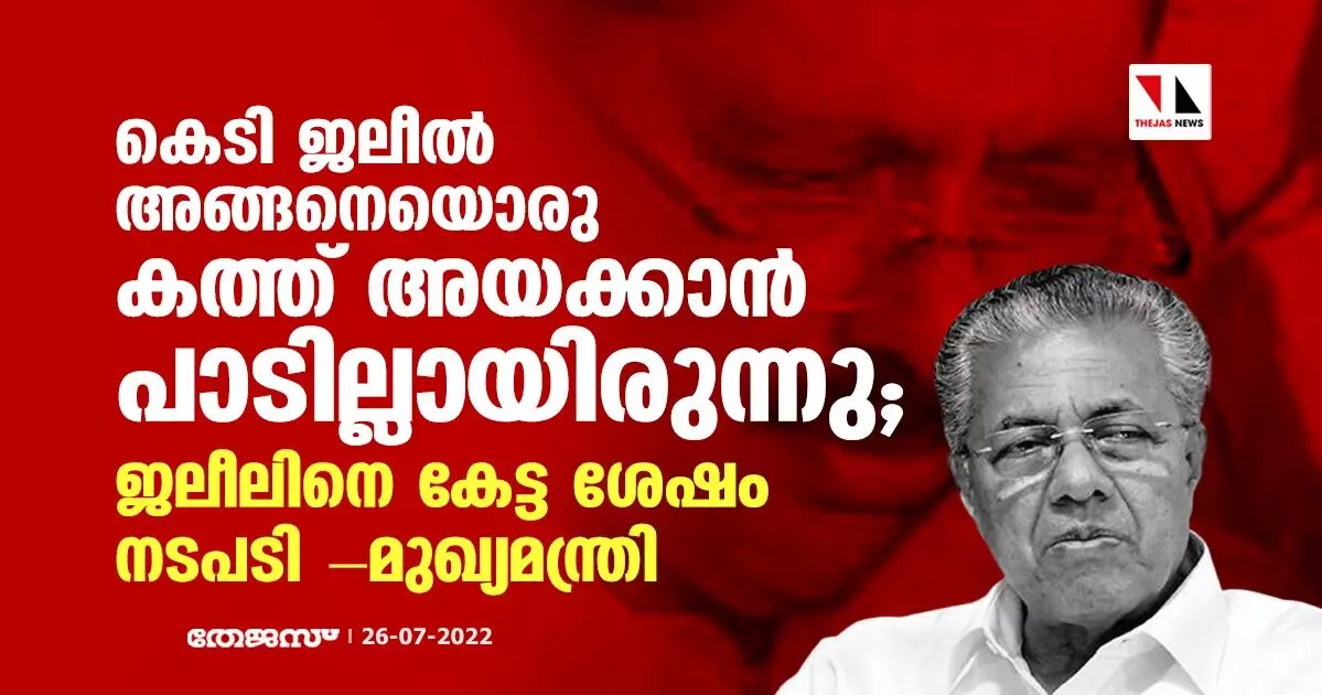 കെടി ജലീല് അങ്ങനെയൊരു കത്ത് അയക്കാന് പാടില്ലായിരുന്നു; ജലീലിനെ കേട്ട ശേഷം തീരുമാനമെന്നും മുഖ്യമന്ത്രി