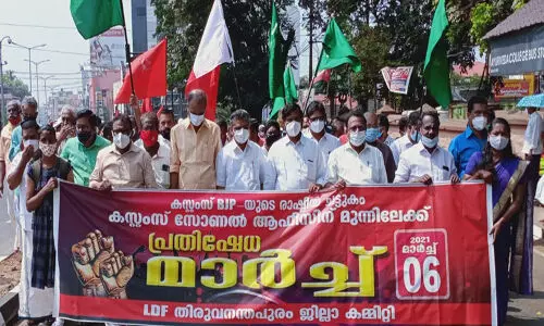 വര്ധിച്ച ജനപങ്കാളിത്തമുണ്ടായിരുന്ന പ്രതിഷേധ മാര്ച്ചുകള് തുടരാനാണ് ഉദ്യേശമെന്നും സിപിഎം തിരുവനന്തപുരം ജില്ലാ സെക്രട്ടറി ആനാവൂര് നാഗപ്പന് പറഞ്ഞു. കൊച്ചിയിലും കോഴിക്കോട്ടും സമാനമായ രീതിയില് തന്നെയായിരുന്നു എല്ഡിഎഫ് പ്രതിഷേധം. ഇന്നലെയും തിരുവനന്തപുരത്ത് ഉള്പ്പെടെ കസ്റ്റംസ് ഓഫിസുകള്ക്കു മുന്നില് സിപിഎമ്മിന്റെ നേതൃത്വത്തില് പ്രതിഷേധ പ്രകടനം നടത്തിയിരുന്നു.