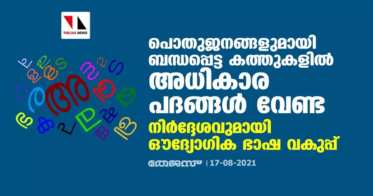 പൊതുജനങ്ങളുമായി ബന്ധപ്പെട്ട കത്തുകളില് അധികാര പദങ്ങള് വേണ്ട; നിര്ദ്ദേശവുമായി ഔദ്യോഗിക ഭാഷ വകുപ്പ്