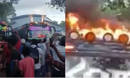 പൂത്തിരി കത്തിച്ച് ബസിന് തീപ്പിടിച്ച സംഭവം: കൊമ്പന് ബസ് മോട്ടോര് വാഹന വകുപ്പ് കസ്റ്റഡിയിലെടുത്തു