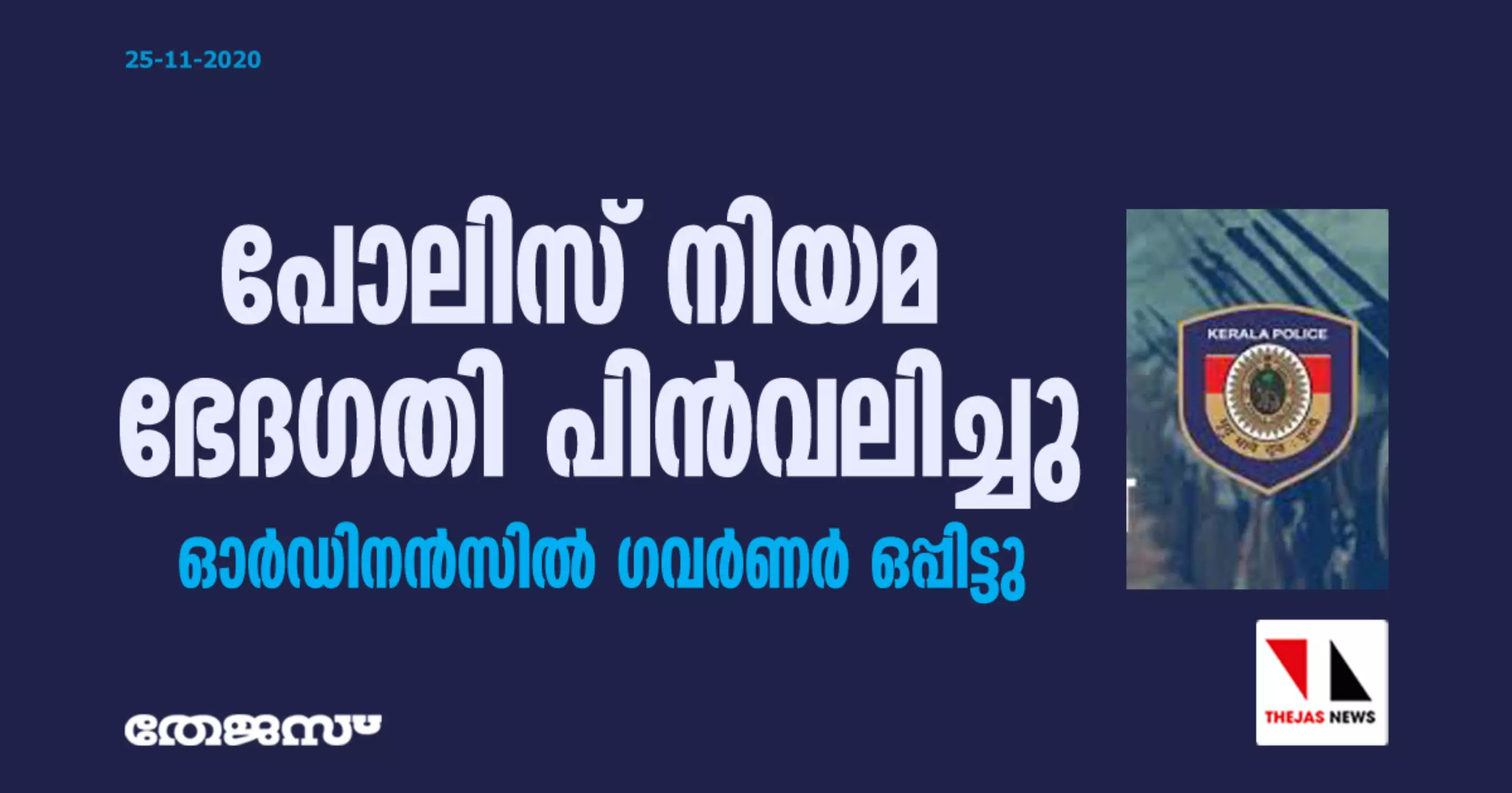 തിരുവനന്തപുരം: സംസ്ഥാന സര്ക്കാര് കൊണ്ടു വന്ന പോലിസ് നിയമ ഭേദഗതി പിന്വലിച്ചു. പിന്വലിക്കല് ഓഡിനന്സില് ഗവര്ണര് ആരിഫ് മുഹമ്മദ് ഖാന് ഒപ്പിട്ടു. ഇന്നലെ ചേര്ന്ന മന്ത്രിസഭാ യോഗം നിയമ ഭേദഗതി പിന്വലിക്കാനുള്ള ഓര്ഡിനന്സ് ഗവര്ണര്ക്ക് അയക്കാന് തീരുമാനിച്ചിരുന്നു.